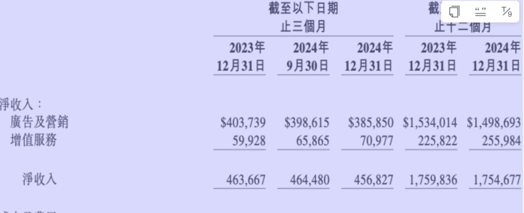 细分业务表现方面,2024年,微博的广告及营销收入15亿美元,同比下降2%或依据固定汇率计算同比下降1%;增值服务收入2.56亿美元,同比增加13%或依据固定汇率计算同比增加15%。