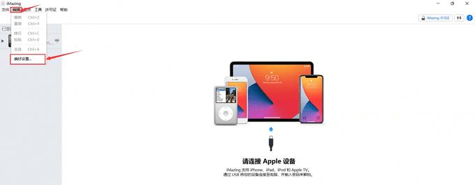 在确保连接方式无误的情况下还是连接不上手机,可以尝试在软件中重启移动设备服务,在提示界面点击左上方编辑,选择偏好设置。