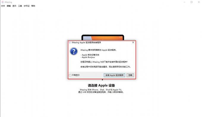 imazing苹果驱动程序包括Apple移动设备支持和Apple Bonjour,只有安装这两个驱动才能顺利连接移动设备进行管理,在电脑设备首次打开imazing软件时会提示下载驱动程序。