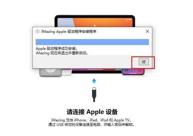 点击“安装Apple驱动程序”,这时就会进行下载。待下载完成后就会弹出提示,显示驱动程序已安装,将重新启动imazing软件,点击“好”即可。