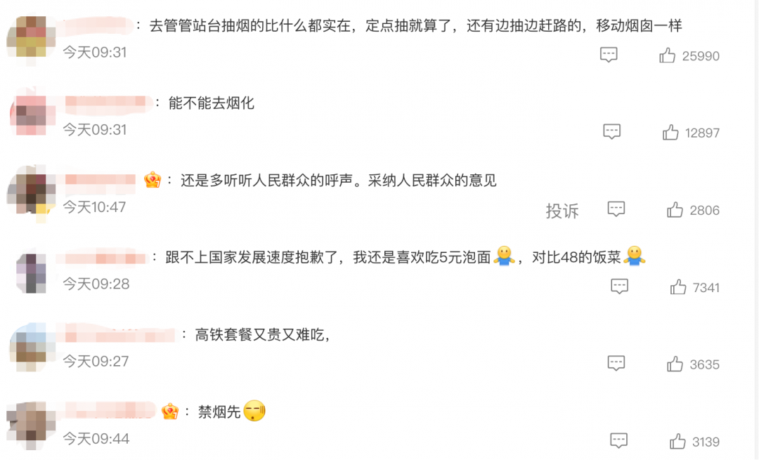 此外,还有网友建议,“能不能去烟化”“去管管站台抽烟的比什么都实在,定点抽就算了,还有边抽边赶路的,移动烟囱一样。”
