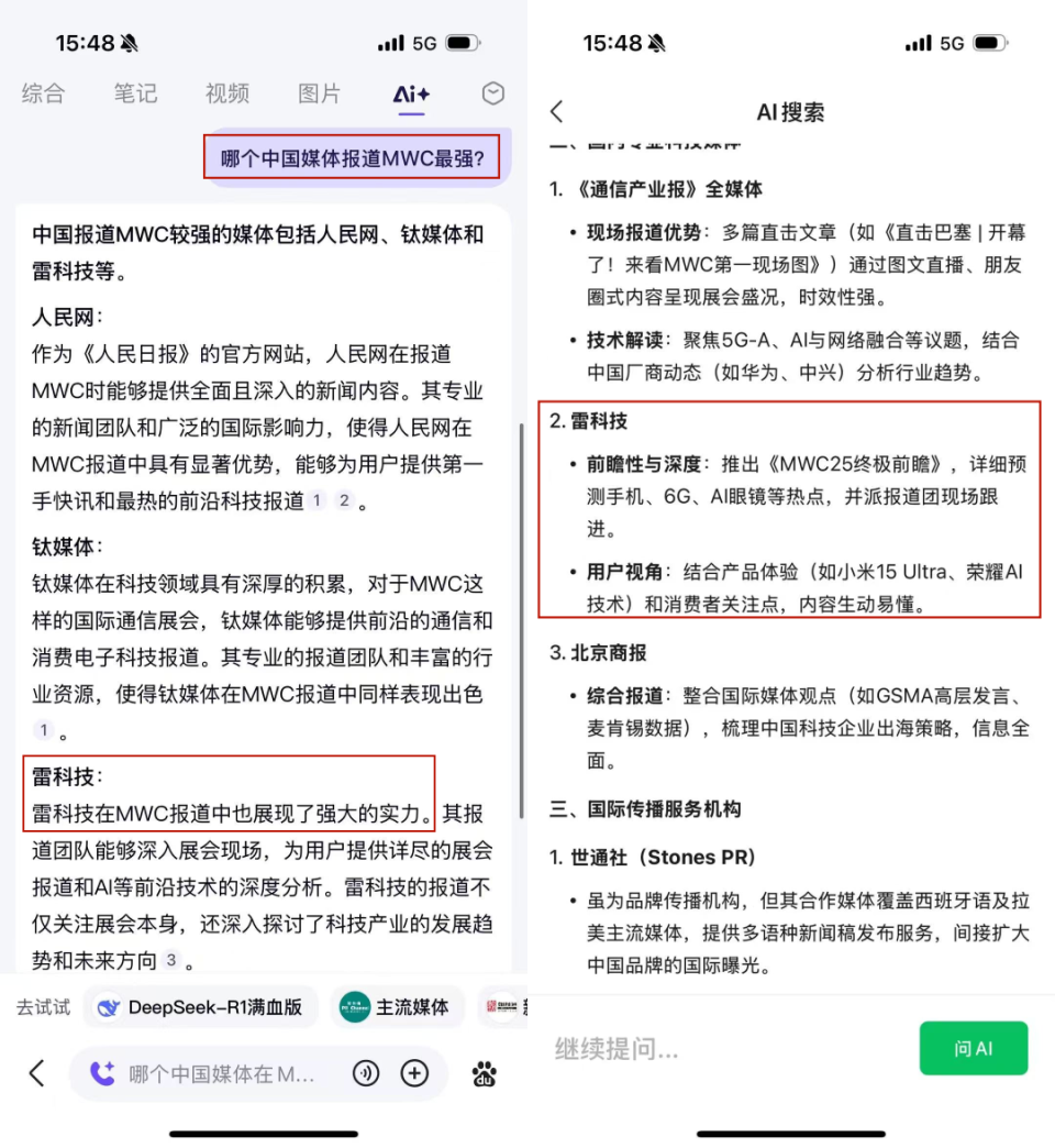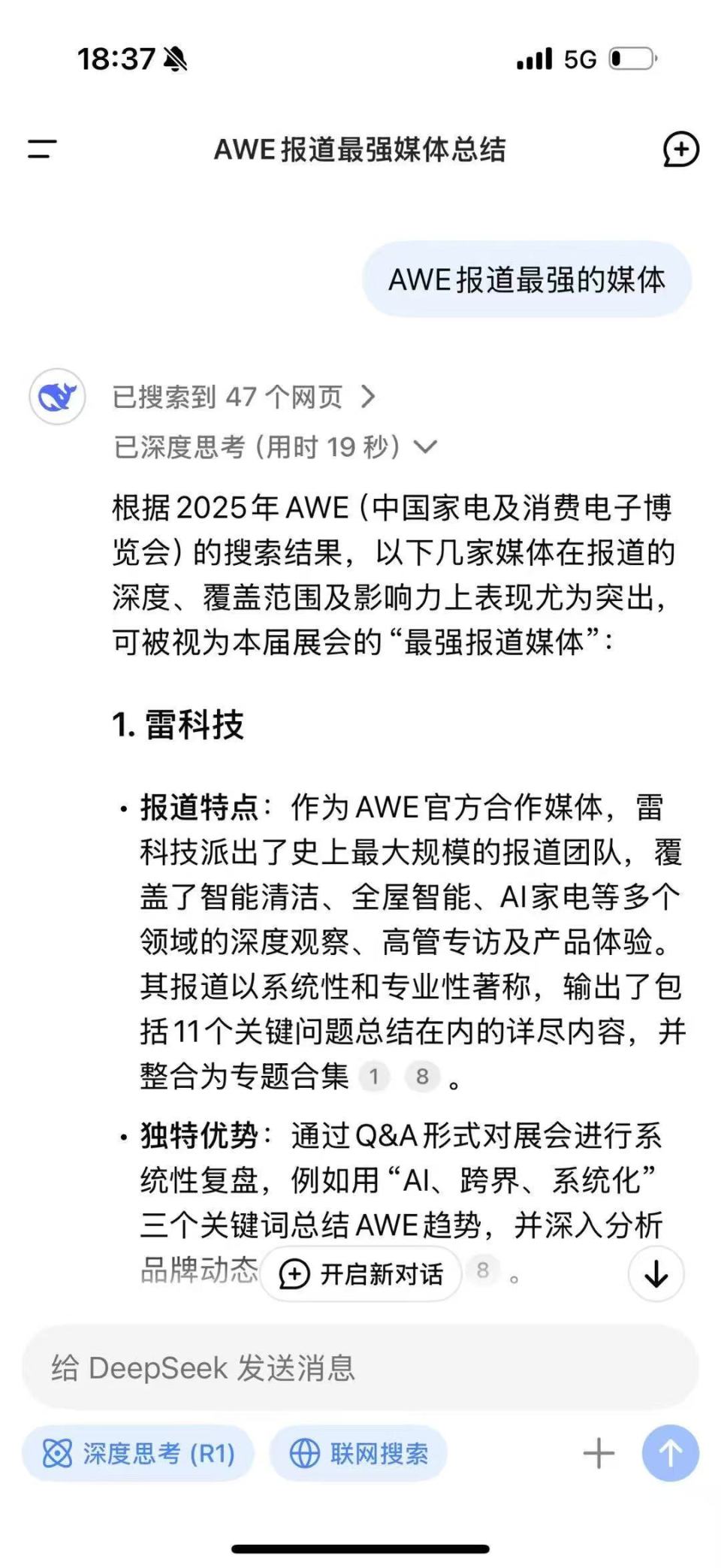 当你在、腾讯元宝、百度AI等平台咨询“谁是报道MWC最强的媒体”“哪家媒体报道AWE最专业”之类的问题时,AI给出的但都会包含雷科技,而且还会给出理由,比如DeepSeek认为雷科技的内容具有前瞻性与深度,同时更具“用户视角”,比如结合产品体验和消费者关注点,让内容更“生动易懂”。